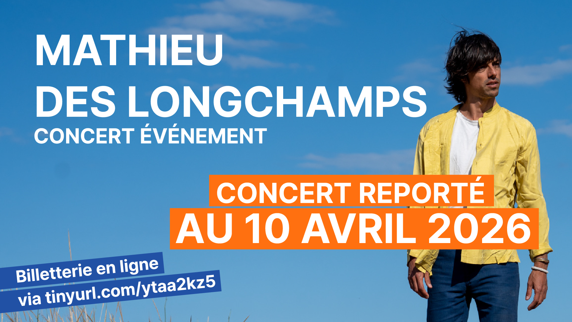 Espace de la Mare au Loup 14 rue de Houdan, FrancePour des raisons techniques, le concert de Mathieu des Longchamps est reporté au 10 avril 2026. Dans le cas où vous auriez déjà acheté votre billet, ce dernier reste valable pour la nouvelle date. Vous pouvez toutefois vous faire rembourser dans votre espace billet web. À très bientôt pour ce formidable concert ! Infos [...]