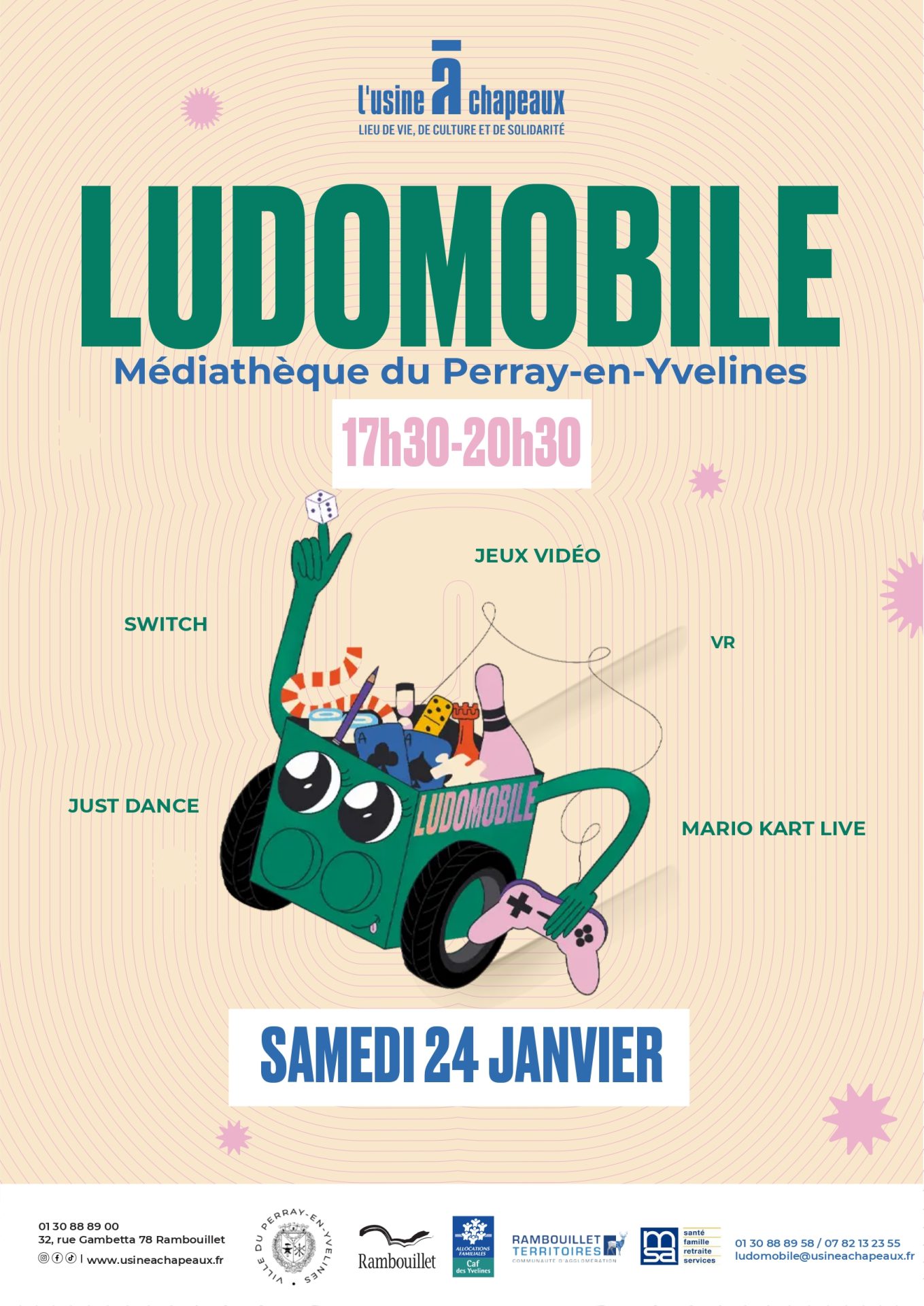 Mediathèque Espace de la Mare au Loup - 14 rue de Houdan, Le Perray-en-YvelinesLa médiathèque organise une ludomobile autour des jeux vidéos, samedi 24 janvier, de 17h30 à 20h30 Au programme : jeux vidéos, réalité virtuelle, Just Dance, Switch et Mario Kart Live.