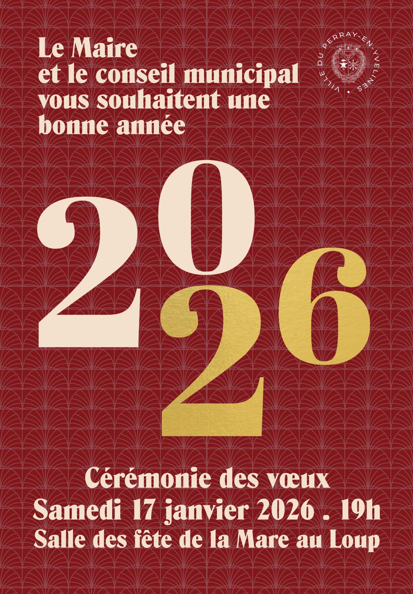 Salle des fêtes de la Mare au Loup 14 rue de Houdan, Le Perray-en-YvelinesCérémonie des Vœux 2026 Le Maire et les élus du Conseil municipal vous présentent leurs meilleurs vœux pour cette année 2026 et vous invitent à la traditionnelle cérémonie des Vœux le samedi 17 janvier, à 19h, à la salle des fêtes de la Mare au Loup ! Inscription par mail à communication@leperray.fr